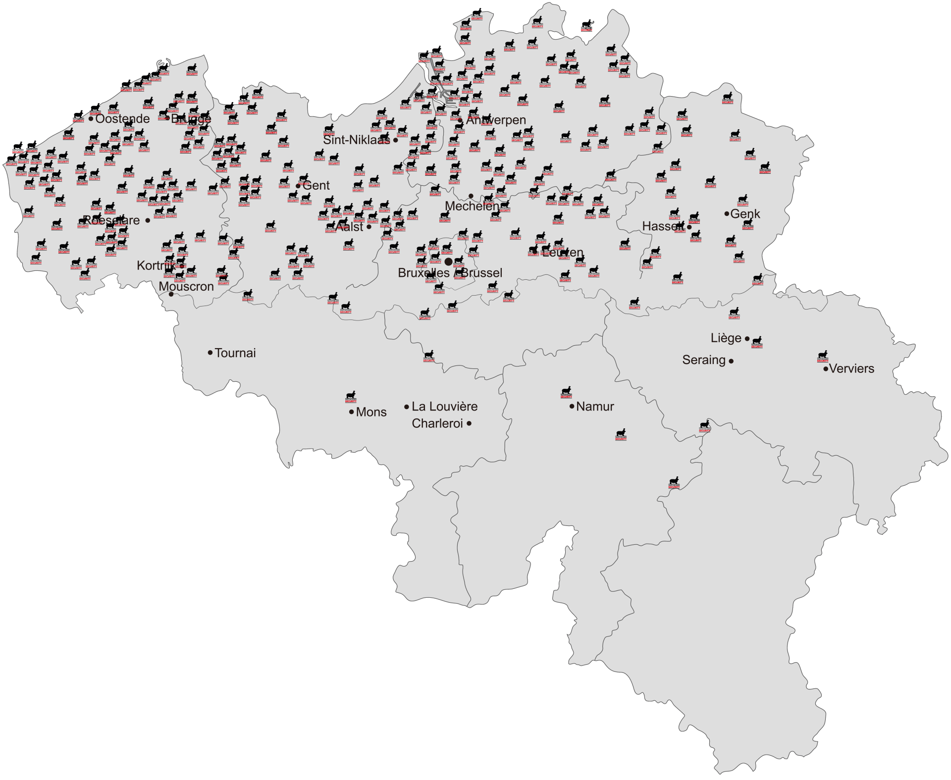 De afgelopen decennia plaatsten wij in heel België duizenden alarminstallaties en systemen voor elektronische toegangscontrole, branddetectie, camerabewaking en integrale gebouwveiligheid. Ontdek op onze overzichtskaart enkele voorbeeldrealisaties die representatief zijn voor onze mogelijkheden.